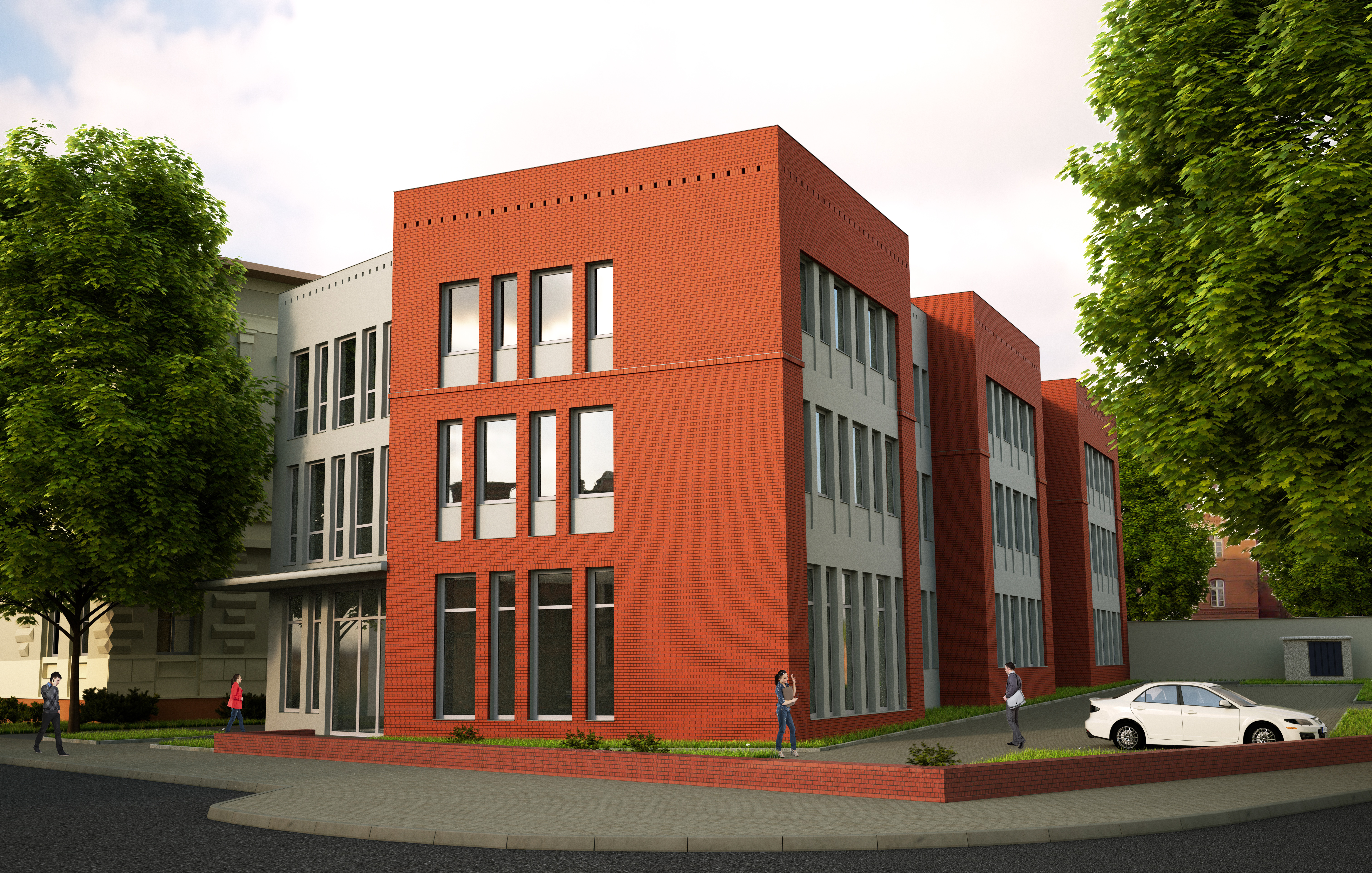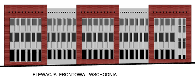 Trzykondygnacyjny budynek charakteryzuje się dużą częścią elewacji otoczonej okładziną klinkierową, która ma spełniać wymagania miejscowego planu zagospodarowania przestrzennego i nawiązywać do dawnych budynków wojskowych. Warto tutaj wspomnie także o utrudnieniu dotyczącym połączenia nowoprojektowanego budynku z istniejącym, a także budowa na granicy działki oraz garaży, których tylna ściana jest na tej granicy. Ściany w sąsiedztwie istniejącego budynku i garaży posadowiono na palisadzie z mikropali wierconych fi30 zbrojonych profilami stalowymi. Dodatkowo cały budynej posadowiony jest na płycie fundamentowej grubości 60cm.
