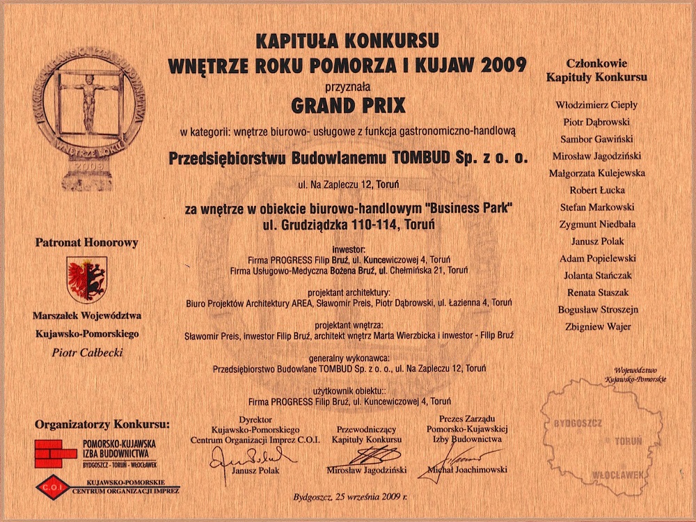 Otrzymanie nagrody GRAND PRIX w konkursie Wnętrze roku Pomorza i Kujaw 2009