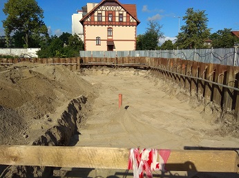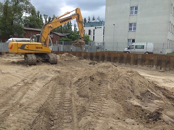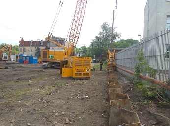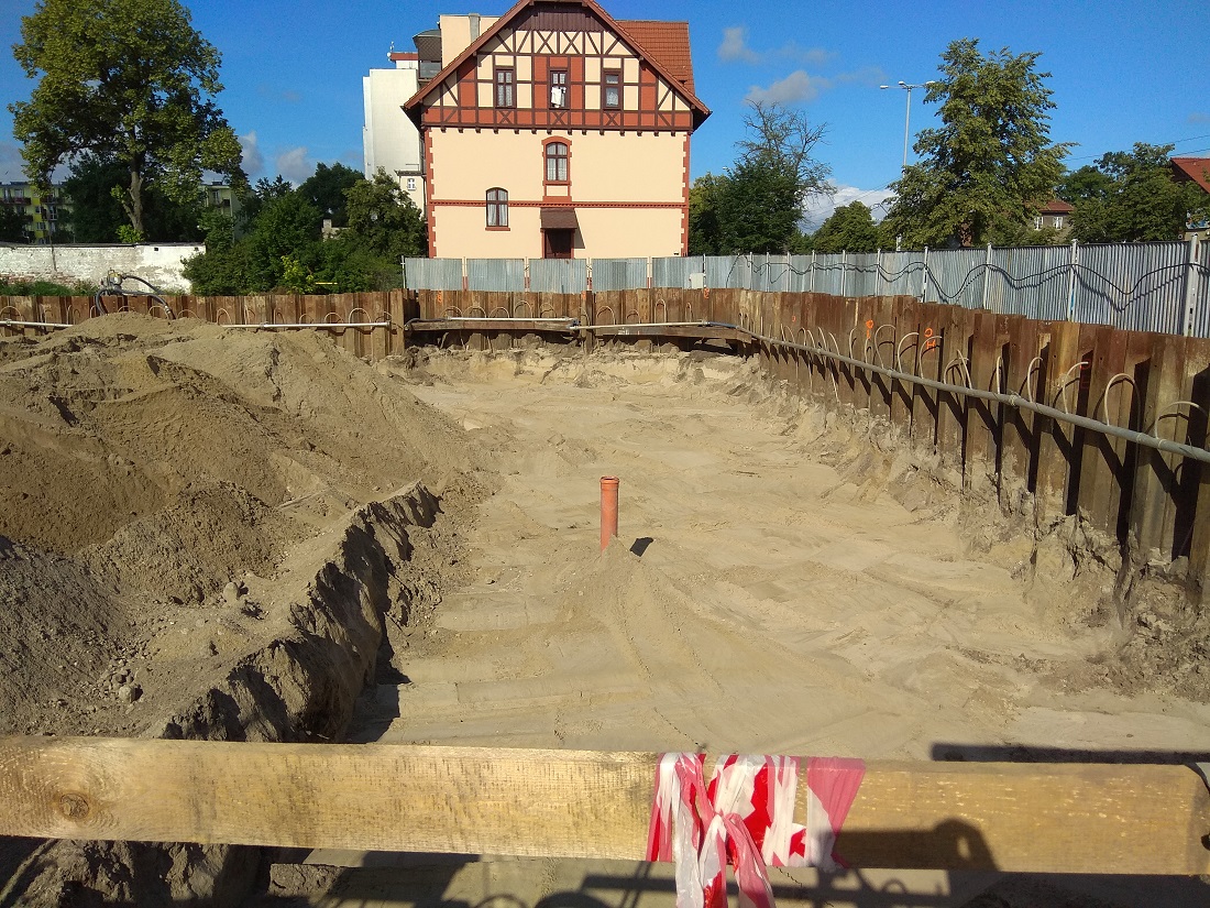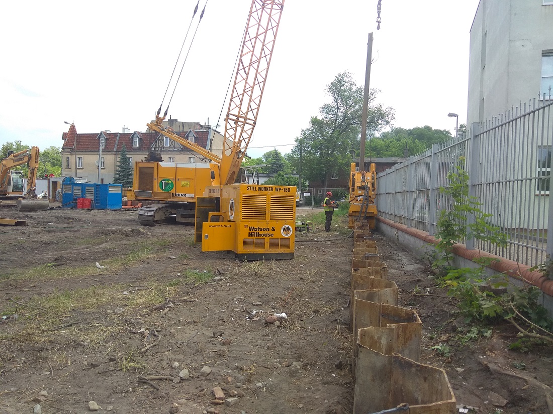 Wykonaliśmy już zabezpieczenie wykopu za pomocą ścianek szczelnych oraz zainstalowaliśmy agregaty pompowe do igłofiltrów. W tej chwili jesteśmy w trakcie wykonywania wykopów pod płytę fundamentową.