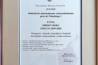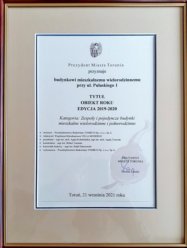 Wśród wszystkich zgłoszonych budynków wielorodzinnych najlepsza okazała się nasza inwestycja Villa Moderno z ul. Pułaskiego 1. Projekt zrealizowany został przez architektki : mgr inż. Agatę Kołodzińską i mgr inż. Annę Trzeciak. Ideą realizacji budynku którą dostrzegła kapituła była inspiracja przedwojennym modernizmem, prostota i elegancja formy, oraz stonowana kolorystyka. Zwrócono również uwagę na to, że trzypiętrowy obiekt zajmuje tylko 25 procent działki, dzięki czemu jest przy nim sporo zieleni.